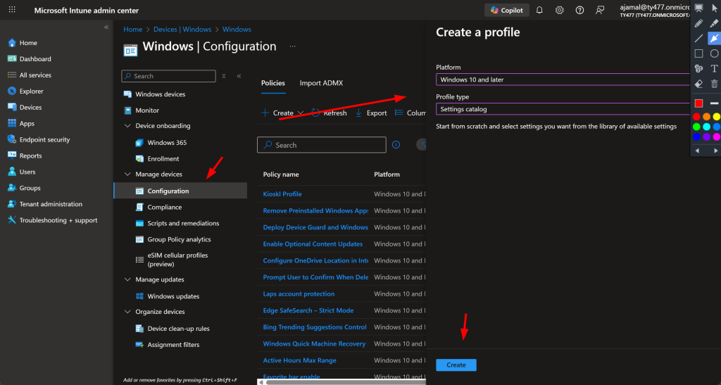- Go to Intune admin center โ Devices โ Windows โ Configuration profiles.
